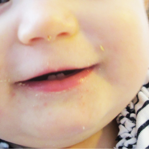 A T. comeu sem qualquer dificuldade, a maçã fica aos pedaços bem moles, mas consistentes para a gengiva desdentada da pequena.