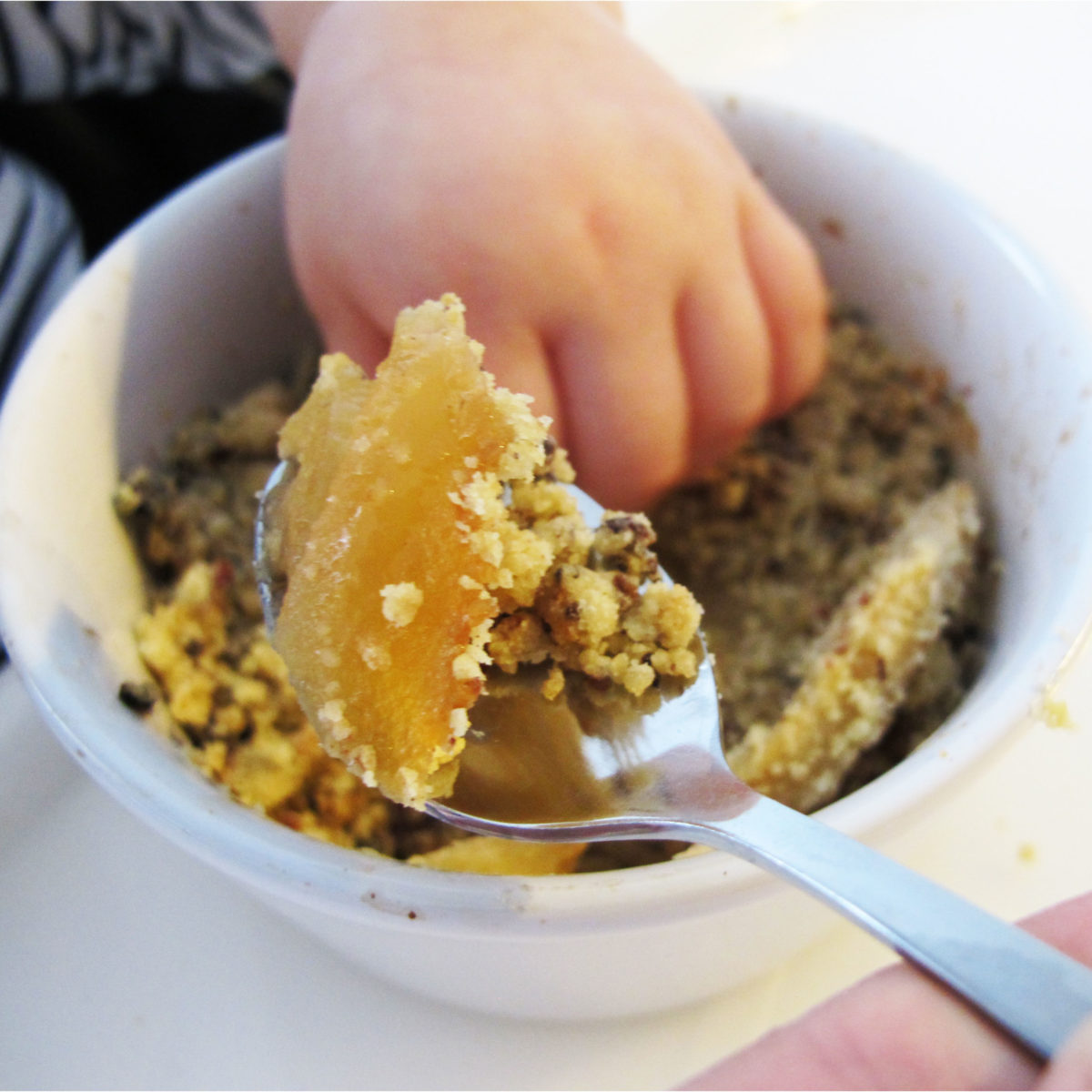 Atenção: o crumble por cima fica muito esfarelado, é preciso cuidado para que os bebés não aspirem e sufoquem. Ter em atenção se o bebé já mastiga e envolve bem o crumble na maçã.