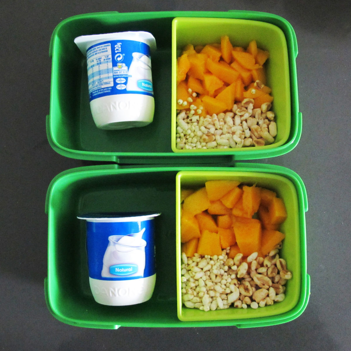 Eu envio sempre a mesma coisa à Lara (tem 18 meses): Tarte de aveia e abananou maçã, bolachas, iogurte e banana. Ando à procura de alternativas.