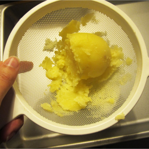 Passo importante: “desfiar” a batata. A batata não deve ser esmagada, nem triturada, nem batida. Deve ser transformada em fios, para que incorpore mais ar nos gnocchi. Existem uns instrumentos próprios para isto, uma espécie de esmagador de alho, mas em tamanho grande; podem usar ainda o passe-vite; mas para quem, como eu, não tem nada disso em casa, um passador de rede funciona igualmente (dá mais trabalho e leva mais tempo).