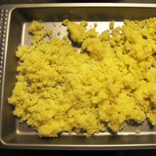 - Com uma espátula vai-se abrindo espaços entre a batata para a farinha unir.