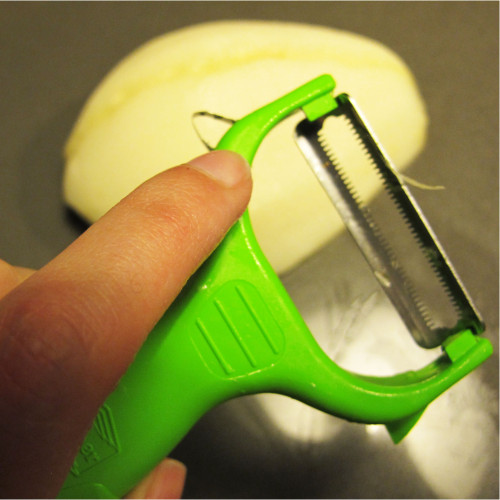 Olhei para o descascador e reparei numa das suas funcionalidades, que de grosso modo serve para fazer decorações em frutas e legumes.