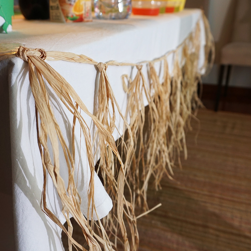 Usei grinaldas de ráfia para decorar a borda da mesa. Atei vários fios de ráfia uns aos outros com o tamanho do perímetro da mesa e fui atando montinhos de ráfia cortada para fazer este efeito.